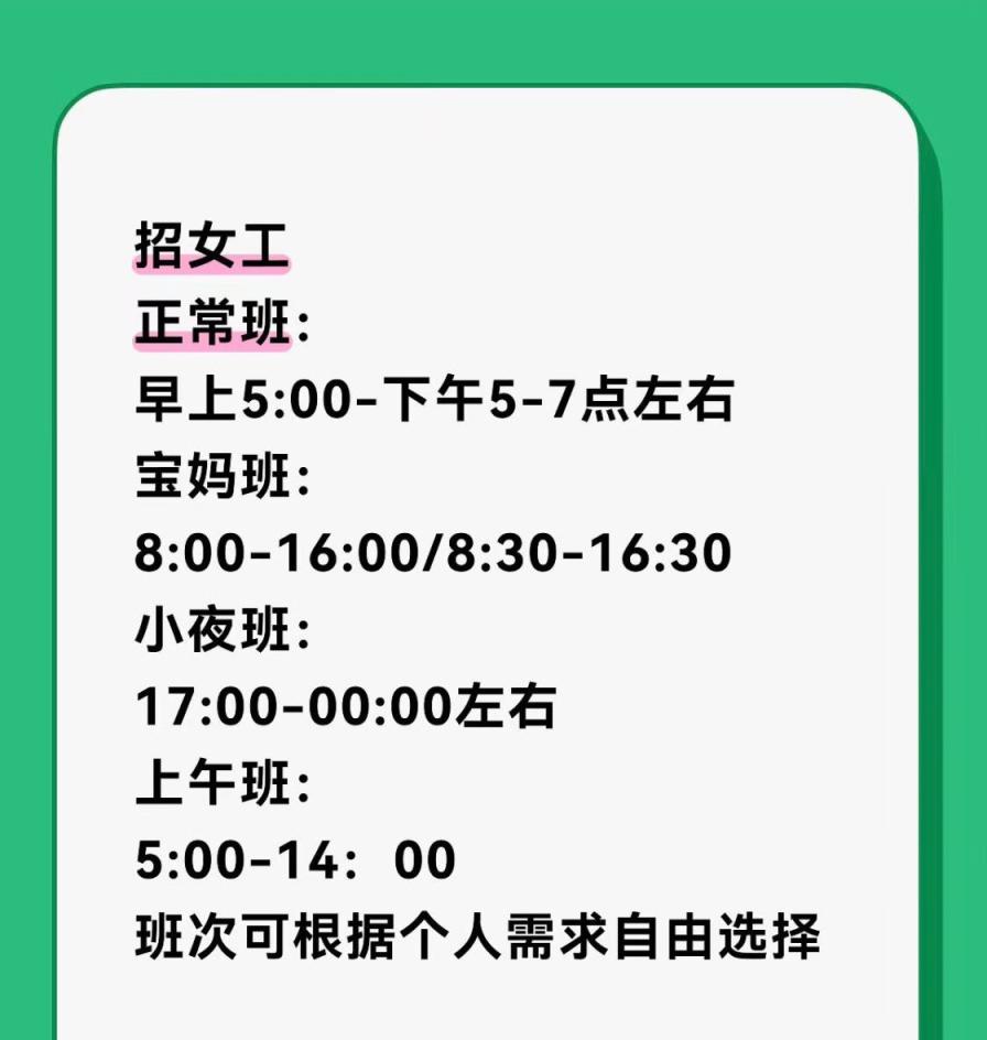 正常上班时间早5点到下午5-7点左右或下午5点到夜里12点左右,干活麻利,工资高。
